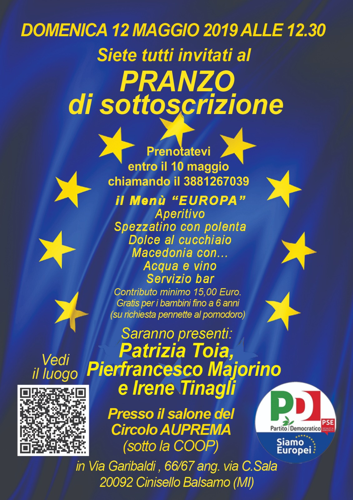 DOMENICA 12 Maggio ore 12:30 presso il Salone del Circolo Auprema ci sarà il PRANZO di sottoscrizione